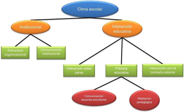 En lo que respecta a los procesos de enseñanza y aprendizaje, Pereira (2010) y Kohl et al. (2013) señalan que las características de personalidad del docente, los diferentes métodos que utiliza para la realización de la clase, el tipo de interacción que hay entre los estudiantes y las condiciones estructurales que presenta la institución, son algunos de los factores que influyen directamente en el clima escolar dentro de las aulas. No obstante, el clima escolar es un concepto multidimensional y que no tiene una definición única, características que hacen compleja su medición (Shukla et al., 2019; Wang & Degol, 2016).