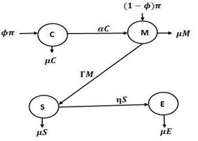 Examination malpractice is a major challenge to the education system in Nigeria. Apparently, a good number of students who are admitted into Nigeria’s tertiary institutions are products of examination malpractice (Ayoade & Farayola, 2020a; Ayoade & Agboola, 2022a). Based on this, a compartmental model CMSE is designed to analyze the trade-off between failure rates and academic standards in the context of tertiary institutions in Nigeria. The model is split into C(t), M(t), S(t), and E(t), respectively, where C(t) is the class for students who got admission into the institution through cheating, M(t) is the class for those who got admission through merits, S(t) is the class for those students who have what it takes to withstand the institution set standard, while E(t) denotes the class of individuals who graduated from the institutions on merit. The movement across compartments of the model is illustrated in Figure 1.