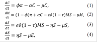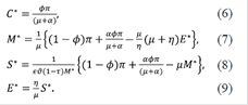 Based on the aforestated assumptions, formulations, and the transfer diagram, the following first-order ODEs are derived: