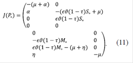 The matrix J (Po) comprises the eigenvalues λ1 = - (μ + α) and λ2 = - μ as well as submatrix A given as