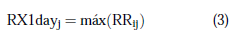 Cantidad máxima de precipitación en un día RX1day, donde RRi j es la lluvia máxima registrada en el día i, y el año j, así se tiene,