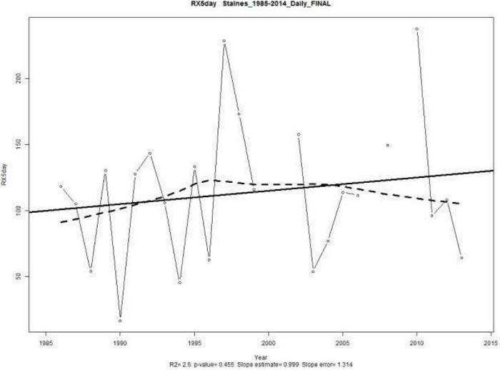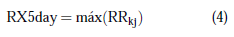 RX5day. Asimismo, se evaluó a RX5day, que se refiere a la cantidad máxima de precipitación registrada en un período de cinco días consecutivos de lluvia, k = 5. Donde,