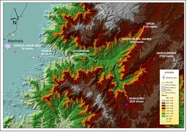 A través de entrevistas y reuniones con los grupos focales, se ha mencionado el saber vernáculo de la zona que indica que “cuando llueve en Cuenca, se inunda Machala”, es decir que las lluvias que ocurren en la zona andina aledaña, cercana a la ciudad de Cuenca, afectan finalmente a los procesos de inundación en la zona costera de Machala, y es por esto que se incluyen en el estudio estaciones meteorológicas que están alejadas de la ciudad, tal como se aprecia en la Figura 1.