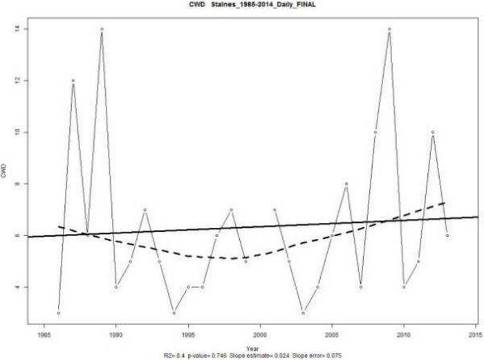 Otra observación se refiere a que la diferencia entre los valores de RX1day, RX5day y CWD, en el sentido de que las lluvias que ocurren a días consecutivos no son una característica este sistema y que tampoco presentan ninguna tendencia que pueda ser mencionada. Es decir, que la mayoría de eventos extremos en las zonas de estudio tienen una duración inferior a un día.