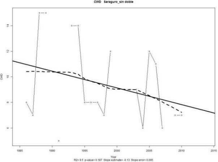 En la Figura 5, se presenta el Número de Días Húmedos Consecutivos (CWD). La estación Santa Inés presentó un valor de pendiente positiva 0.024(0.075) días/año, pero poco significativa (valor-p de 0.746), la gran desviación se debe a que se tienen dos picos, cuyos valores máximos se presentaron en los años 1989 y 2009, ambos con 14 días consecutivos de lluvia. Mientras que en la estación Saraguro presenta una pendiente negativa estadísticamente significativa (valor-p de 0.187) e iguala −0,13(0,095) [días/año]. Registrando sus valores máximos fueron en los años 1988 y 1989 con un valor de 15CWD. Estas tendencias muestran cómo en la región de la sierra se evidencia no sólo regímenes lluviosos diferentes a los de la costa, sino que en disminución.