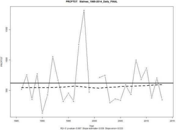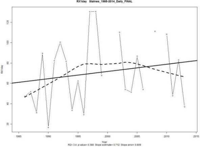 En las Figura 6 y 7, se presentan datos de la cantidad máxima de precipitación registrada en un día RX1day, de cada año. Indicador importante de los ventos de inundaciones; ya que según los reportesde la SNGR, las inundaciones se producen por precipitaciones que difícilmente superan las 24 horasde duración (SNGR, 2012). En la estación Santa Inésse tiene una tendencia positiva de 0,712 [mm/año]con un valor-p de 0,388. Por otro lado la cantidad máxima de precipitación en cinco días RX5day tiene un valor de 0,999 [mm/año] con un valor-p de0,455. Cabe indicar que aunque en ambos casos la tendencia no es suficientemente significativa, este comportamiento se debe a la presencia de ENSO,evento que provoca una enorme variabilidad en el sistema, pero que no se puede eliminar del mismo.Finalmente, la variabilidad e impredecibilidad del sistema climático es una realidad que estará presenteen los cálculos.