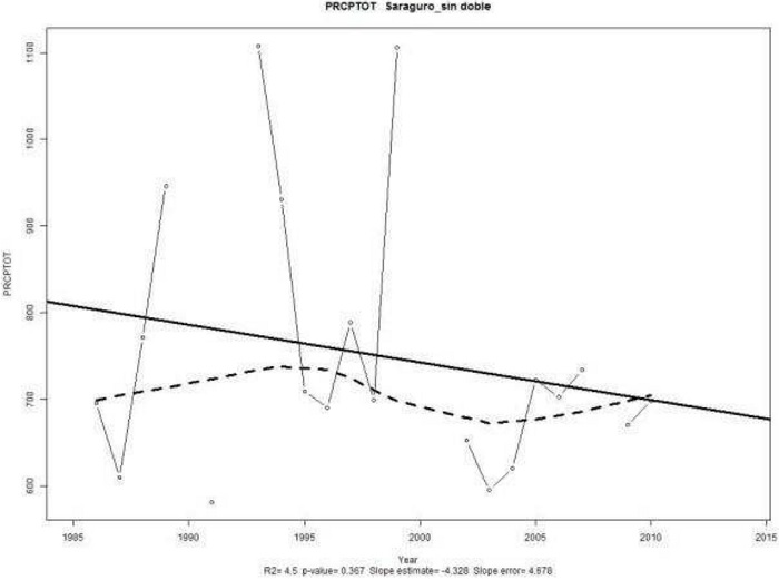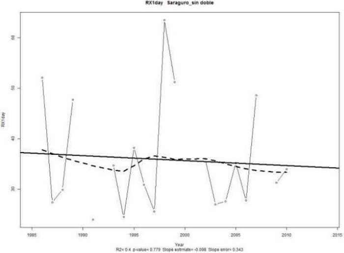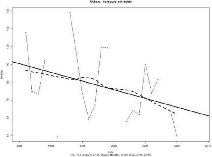 A estudiar la estación Saraguro se nota una variación entre los valores de RX1day con una tendenciade −0,098 [mm/año] con un valor-p de 0,799 y el RX5day con un valor de −0,972 [mm/año] con un valor-p de 0,105*, la primera tendencia estadísticamente significativa (p≤0.2), lo que nos indica una disminución a futuro de días consecutivos de lluvia en la región Sierra; en contraste a lo que ocurre en la Costa.