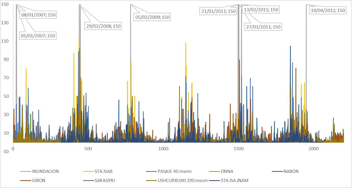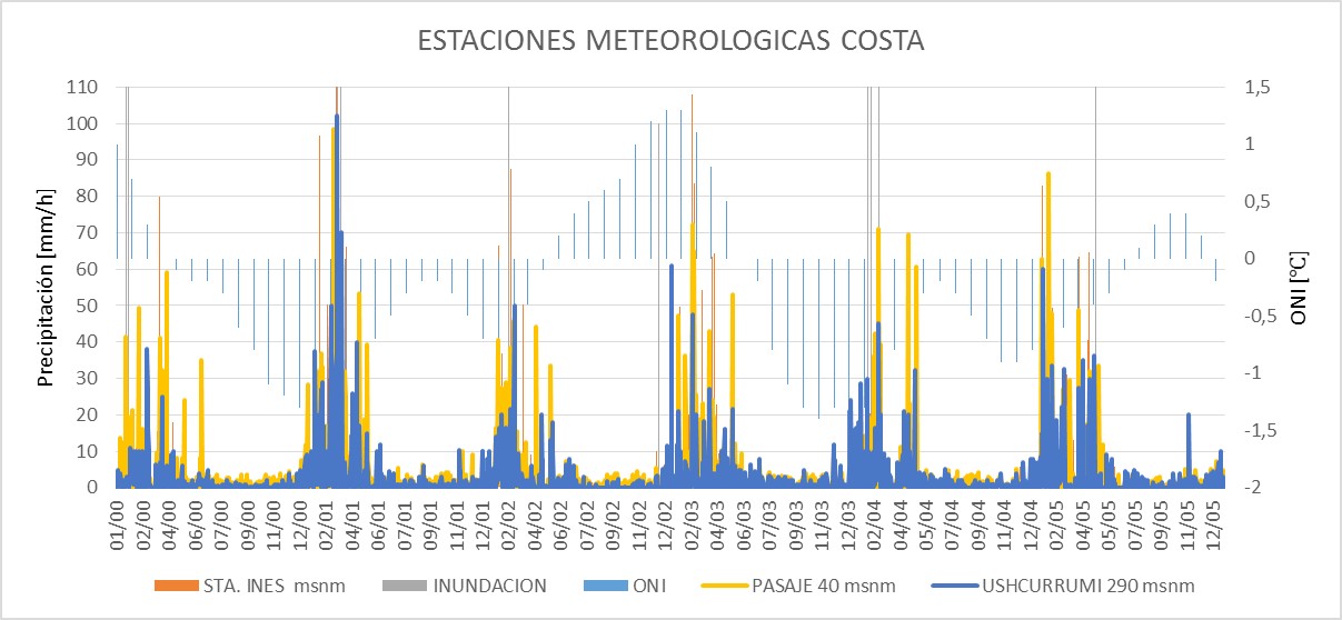 En la Figura 3 se logra visualizar la relación queexiste entre los datos de precipitación de las estaciones meteorológicas ubicados en la región costa, los reportes de inundación y el ONI. En este caso,al ser ONI un dato mensual de temperatura superficial del mar, contrastado con los datos diarios de precipitación, se ubicó su valor, en el día 15 de cadames.