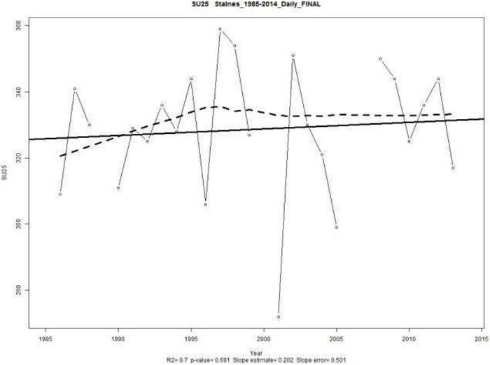 SU25. En cuanto a los índices de temperatura, sepuede mencionar al SU25, también conocidopor “días de verano al año”, que cuenta el númerode días en donde la temperatura máximadiaria TX, es superior a los 25◦C; de allí el nombre del índice (SU25, por summer days),así: