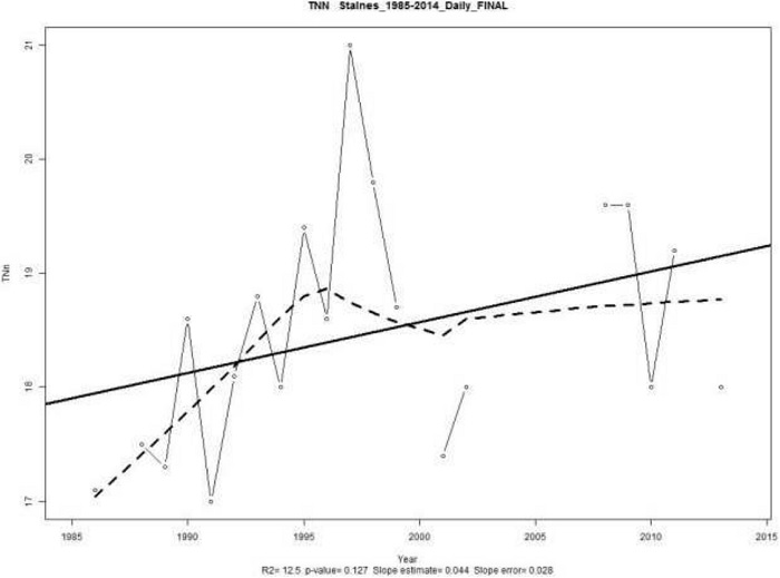 En la Figura 10, se muestra un incremento enel valor de las temperaturas mínimas 0,044◦C/año,con un valor-p de 0,127 que indica una tendencia significante estadísticamente.