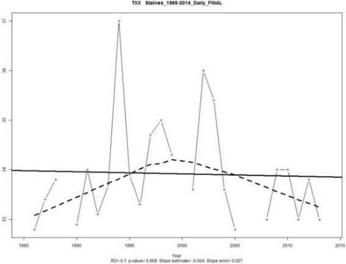 Finalmente, en la Figura 11, se presenta el comportamientode los valores anuales máximos detemperatura máxima diaria, se aprecia una tendenciade −0,004◦C/año sin significancia estadística (p=0,868), misma que se ve afectada por la presencia de ENSO; sin embargo, a pesar de que no existe una tendencia de incremento o decremento, se aprecian una ubicación del promedio de temperatura máxima alrededor de los 34◦C; estas temperaturas son bastante elevadas inclusive para ciudades que se ubican en la región costa.