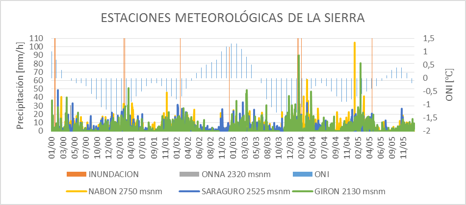 En la Figura 4 se observa la relación existente entre la precipitación registrada en las estaciones de la región Sierra con ONI, y los reportes de inundación.