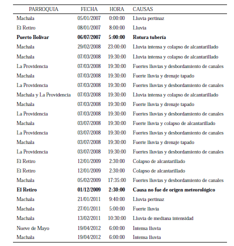 La Secretaría Nacional de Gestión de Riesgos del Ecuador (SNGR) ha generado un reporte de inundaciones tomado desde el año 2007 hasta el 2012. En este tipo de reporte se indica la fecha en la que se generó la inundación y detalles de las causas de este fenómeno, tal como se presenta en la Tabla 1. De los 29 eventos de inundación solo 2 no fueron causados por lluvias, estos fueron causados por rotura de cañería en la parroquia de Puerto Bolívar y la segunda se presentó en la parroquia El Retiro la cual no es de origen meteorológico, no determinado.