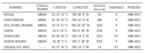 Los datos meteorológicos fueron entregados por el INAMHI y a la Universidad Estatal de Machala UEM (estación Granja Santa Inés), previo un control de calidad y homogenización. Debido a la fina localización temporal (horas o minutos) y espacial (decenas de kilómetros cuadrados), que los eventos extremos suelen tener, es requisito contar con una resolución mínima diaria de los datos. Por otro lado, para realizar un estudio de cambios en la climatología se requiere un rango temporal mínimo de 30 años. De esta manera, los datos de las estaciones estudidadas se presentan en la Tabla 2.