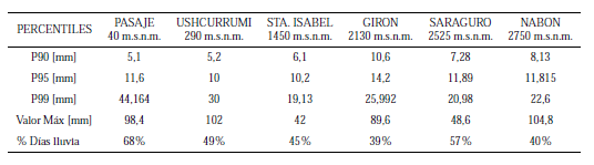 En la Tabla 3, se aprecia que el porcentaje de días lluviosos e intensidad de lluvias intensas es prácticamente mayor en la zona costera, descendiendo moderadamente en la sierra. Sin embargo, es más notable la gran diferencia que existe entre los valores máximos detectados y el percentil 99 registrado. Esta gran diferencia es muestra de lo poco representativos que son los eventos extremos de una zona de estudio.