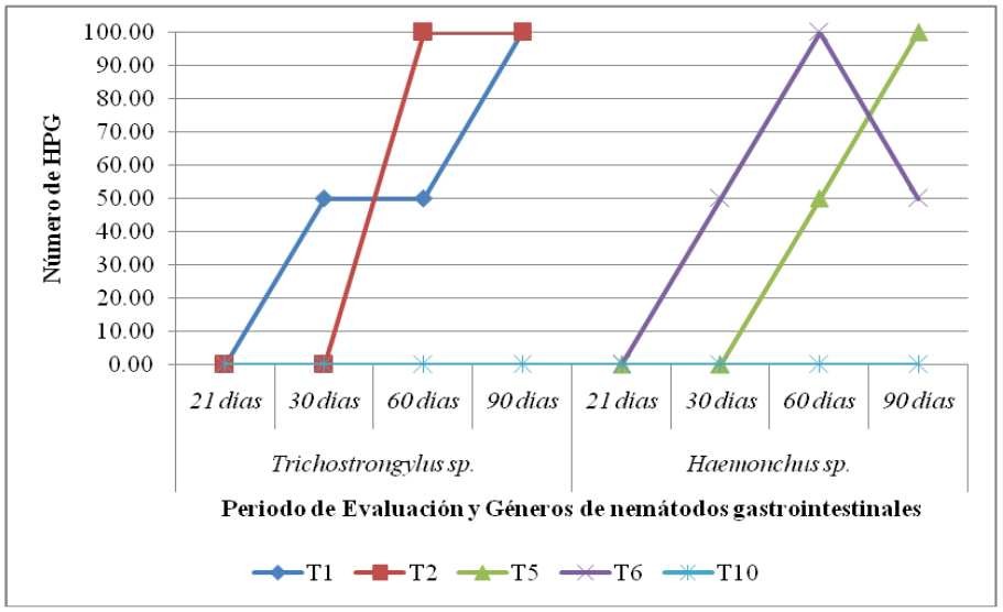 Los tratamientos efectivos (>90%) hasta los 21 días post-aplicación fueron el T1, T2, T5, T6 y T10. Existe variabilidad en la reinfestación de huevos de nemátodos gastrointestinales de los géneros Trichostrongylus sp. y Haemonchus sp. durante la evaluación a los 30, 60, y 90 días en los tratamientos evaluados (Figura 1); esto se atribuye a que la reinfestación de nemátodos es variable dentro de las diferenteses pecies de parásitos así como en función de ciertas características individuales del hospedador, como la edad y el estado inmunológico. Otro aspectoa considerar en este caso se refiere a la presencia de individuos susceptibles a la reinfección como consecuencia de la constante exposición a los parásitos y la corta persistencia del producto administrado en forma convencional (FAO, 2003).