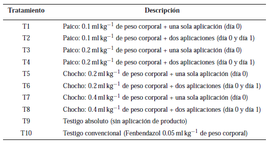 La aplicación de los productos naturales se realizó por vía oral en todos los tratamientos. Según Finkeros (Finkeros, 2012), la dosis del extracto acuoso de paico, que se usa como antiparasitario gastrointestinal en bovinos, es de 0.1 ml kg−1 de peso corporal; mientras que, según Torres, (2006), la dosis del extracto fitoquímico de chocho, que se usa como antiparasitario gastrointestinal en bovinos, es de 0.2ml kg−1 de peso corporal.