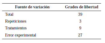 Se utilizó el análisis de varianza descrito en la Tabla 3. Los rangos de significación de las variables que resultaron significativas fueron establecidos mediante la prueba de Tukey al 5%. Los datos obtenidos durante el proceso experimental fueron analizados con el software estadístico InfoStat versión 2015.
