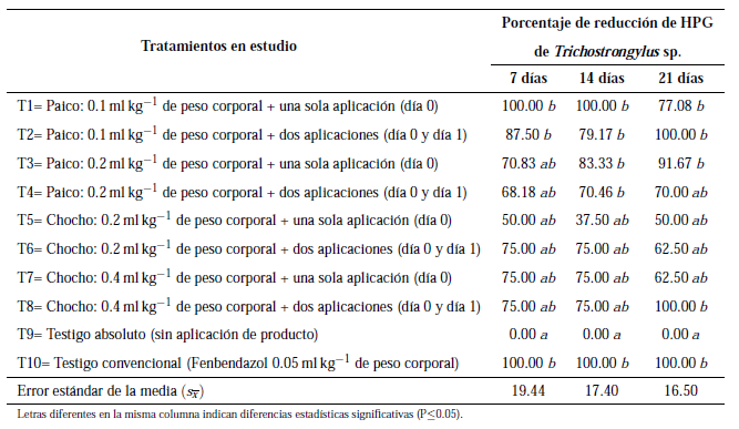 Los promedios y la prueba de Tukey al 5% para la variable efectividad de los productos sobre la carga parasitaria de nemátodos del género Trichostrongylus sp. a los 14 días post-aplicación (Tabla 4), muestran dos rangos de significación, reportándose solo en el rango a al tratamiento T9 con 0% de efectividad, en los rangos ab a los tratamientos T4, T5, T6, T7 y T8 con porcentajes de efectividad entre 37.50%y 75%, y solo en el rango b a los tratamientos T1, T2, T3 y T10 con porcentajes de efectividad entre79.17% y 100%. Los tratamientos considerados efectivos son los tratamientos T10 y T1 con el 100% de efectividad y el tratamiento T3 con el 83.33% de efectividad sería calificado como una ayuda en elcontrol.