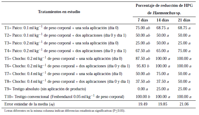 La respuesta de la aplicación de los extractos evaluados sobre Haemonchus sp. fue variable, siendo los más efectivos los tratamientos T5 con un promedio del 95.83% de efectividad y el T6 con un promedio del 81.94% de efectividad durante todo el período de evaluación, por lo que se considera que estos tratamientos de origen natural presentan respuestas favorables para el control de este parásito, ya que tienen una efectividad promedio superior al 80 %.