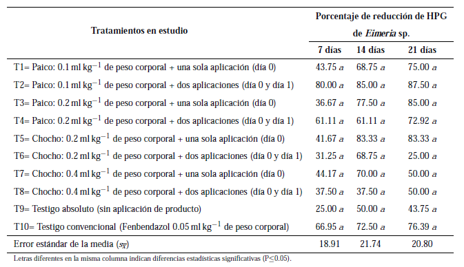 En la Tabla 6 se reportan los promedios de las variables efectividad de los productos sobre la carga parasitaria de protozoarios del género Eimeria sp. a los 7, 14 y 21 días post-aplicación. A pesar que no se reportaron diferencias estadísticas entre los promedios de los tratamientos a los 7, 14 y 21 días post- aplicación, el tratamiento T2 presentó los mayores porcentajes de efectividad de 80%, 85% y 87.50%, a los 7, 14 y 21 días post-aplicación, respectivamente. Ningún tratamiento fue completamente efectivo para el control Eimeria sp., pero los tratamientos que redujeron la carga parasitaria de protozoarios del género Eimeria sp. fueron el T2 y el T5. Estos resultados dan a relucir que el ascaridol contenido en el extracto acuoso de paico al ser un antihelmíntico natural, posee efectos negativos sobre el crecimiento de este género de parásitos (Jurado et al., 2007; Chacón et al., 2009). De igual manera se deduce que los alcaloides lupanina y esparteína presentes en el extracto fitoquímico del chocho, tienen un buen efecto antihelmíntico (Gross, 1992; Torres, 2006).