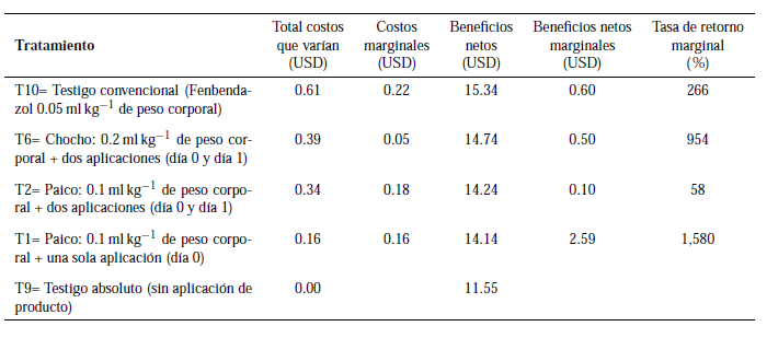 El análisis económico de presupuesto parcial se basó en los costos de los insumos y su preparación; un litro de extracto acuoso de paico cuesta USD 0.67 dólares y un litro de extracto fitoquímico del paico USD 0.83 dólares, en cambio, un litro de Febendazole tiene un costo de USD 40 dólares. El precio referencial de un kilogramo de carne de un animal en pie fue de USD 1.10 dólares, tomando en cuenta los mercados de Machachi, Quito y Santo Domingo de los Tsáchilas.