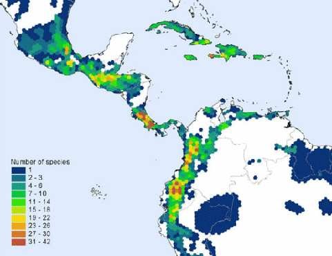 Todavía una gran cantidad de especies de ranas, sapos, salamandras y cecílidos se encuentran amenazados a lo largo de toda América Latina, especialmente en su región tropical. En la Figura 3 se puede observar cómo en las regiones más cercanas a la Línea Equinoccial, se encuentran aquellas con un mayor número de especies amenazadas.