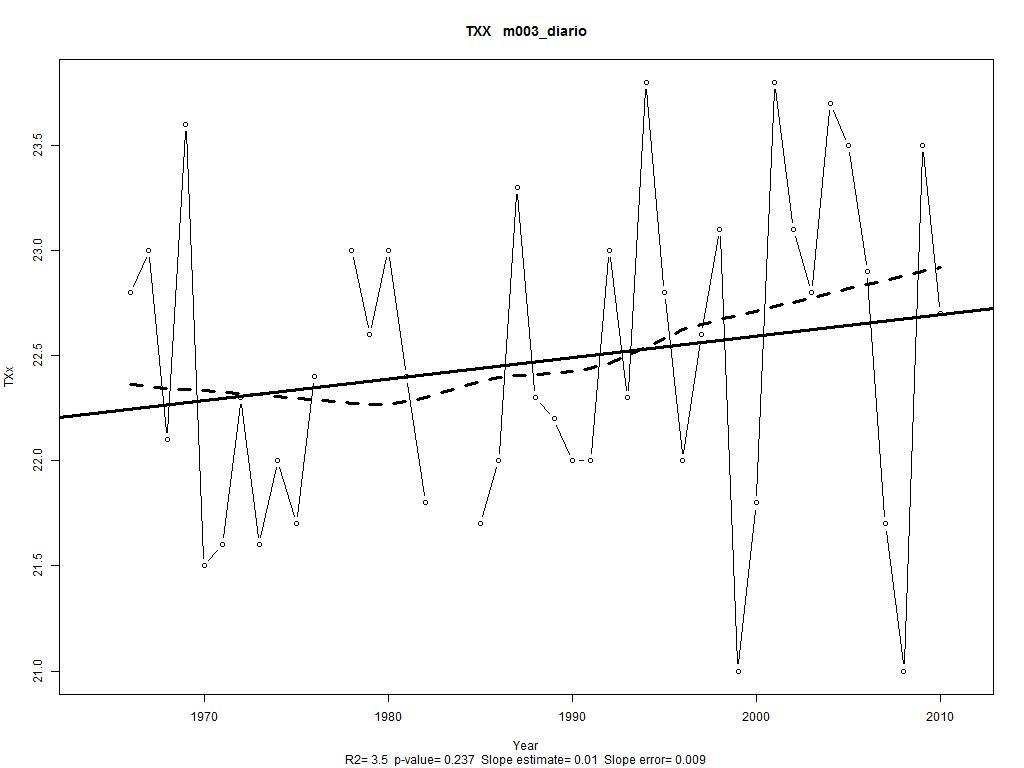 In Figure 1 the behavior of the maximum monthly value of the daily maximum temperature (TXX) in Izobamba, analysis achieved by R-ClimDex is shown. The trend of 0.01oC per year is statistically significant at 76.3% (Serrano et al., 2012).