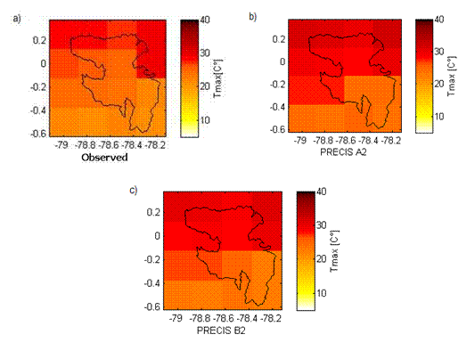 The GCM simulated data were regionalized using the technique of approaching averages, taking into account the annual mean temperature maps of the Ministry of Environment (MDMQ, 2011) and PRECIS model outputs, thus maps are presented with the resolution of this latter model. In Figure 3(a) shows the highest values of annual maximum temperatures that can be expected to 2032 year, these results take into account the dynamic forcing calculated by PRECIS scenarios A2 and B2, which are shown in Figure 3(b) and 3(c) respectively.