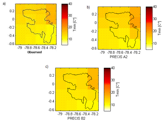 In the case of minimum temperatures, in Izobamba whose average daily minimum temperatures are 6◦C, is expected to record extreme eventsof 11.4◦C, 11.6◦C and 11.8◦C according to statisticaldata and scenarios A2 and B2 respectively, anincrease of nearly 7◦. In Papallacta, with an average lowest temperature of 5.5◦C, it is expected to have extreme temperatures as low as 10.1◦C and A2 and B2 respectively 13.6◦C and 11.4◦C models, anincrease of more than 8◦C. Also, in the warmest region of the DMQ, where station Tabacundo Tomalonis located, has an average of 9.11◦C, and the modelcan be registered 16.2◦C, 16.8◦C and 16.5◦C accordingto statistical trend and the two scenarios A2 and B2, i.e. more than 7◦C for the next 10 years.
