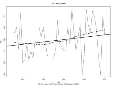 In addition to the gradual behavior of a variable such as temperature, extreme events should also be recorded. The CCI / CLIVAR / JCOMM (Expert Team on Climate Change Detection and Indices) proposed a methodology which includes the RClimDex program for study extreme events in a climate change scenario (Karl et al., 1999; Peterson, 2001).