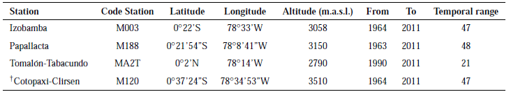 As for the northeast, where the station Tomalon-Tabacundo is located, average rainfall of 4.3 mm/day and can record maximum of 56.5 mm/day are recorded. It should be noted that in this area the rains are often scarce, and there is a tendency to decrease precipitation and hence the hardening of dry regime.