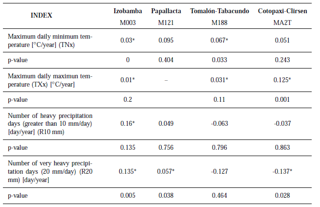 Thus, using RClimDex over the Metropolitan District of Quito DMQ, three possible threats related to climate change were identified: the extreme values of maximum and minimum daily temperatures all over the region, and the intensity of rainfall over the 90th percentile in the south and southwest of the DMQ. This analysis was constructed using available data from weather stations of INAMHI (Instituto Nacional de Meteorología e Hidrología de Ecuador) of the past 47-48 years (except station Tomalón-Tabacundo) with 21 years, located in four points of the District (Table 1). The trends are shown in Table 2.