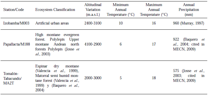 The DMQ is characterized by a great climatic and orographic variety, with the northwestern tropical, desert in the Guayllabamba Valley, the interandean permanently clouded forest in the cold mountain to urbanized city of Quito between the mountains that surround it. Giving as result a wide variety of ecosystems. However, due to the nature of the research, daily station data available only describe three types of ecosystems –with enough confidence–, which are presented in Table 3.