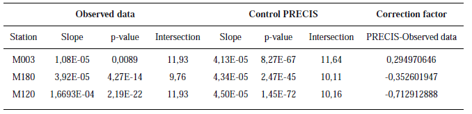 In order to determine the validity of PRECIS, itsgridded outputs for temperature, were used in the“control” period from 1960 to 1990 and comparedwith similar temporal periods for each station. A linearcorrelation for both the observed data and the modeled by PRECIS was made, finding the slope,the intersection in the middle of the series and thep-value for each case and achieving a correction factorby the difference in to the middle of the studiedseries (Table 4).