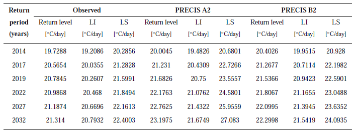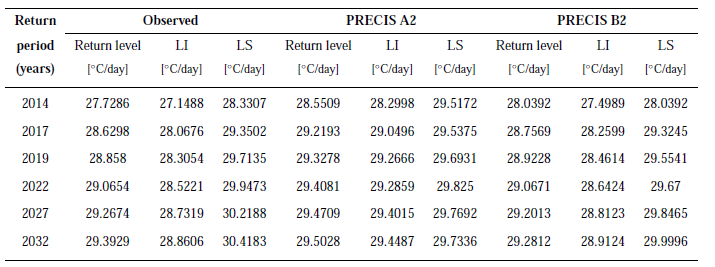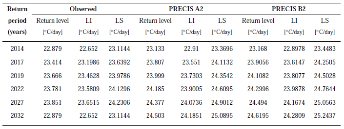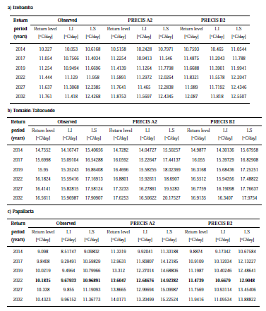 −0,33074(0,19109), showing that these data follow a Weibull distribution; the p-valuewas 0.1150664. The return levels and confidence limitsof the observed data and for the A2, B2 scenariosis presented in Table 6.