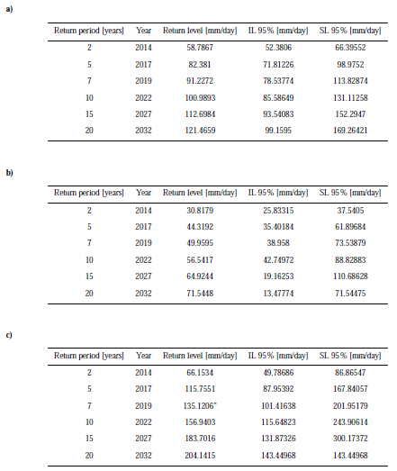 However, in the case of precipitation, there was not detected a direct dynamic forcing producing its increase over time (IPCC, 2014), but the increase in extreme weather events in general. That is why we did not use PRECIS scenarios. Return levels and confidence intervals are calculated only with the observed data, as shown in Table 9.