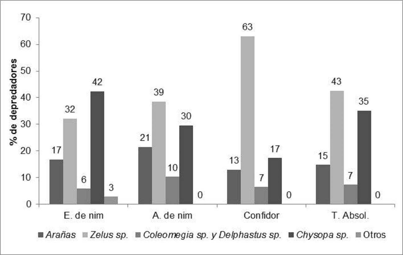 No fueron observadas diferencias estadísticas enel número de depredadores/planta entre los tratamientos ,en ninguna de las cuatro fechas de evaluación.En la Figura 1, se aprecia la distribución porcentual de los principales depredadores asociados a B. tabaci en melón, determinándose, que Zelus spp.(Hemiptera: Reduviidae), fluctuó entre 63% de individuos registrados en el tratamiento imidaclopridy 32% en aceite de nim. Chrysopa sp. (Neuroptera:Chrysopidae), fluctuó entre 42% en extracto acuosode nim y 17% en Imidacloprid. Arañas y coleópteros de los géneros Coleomegila y Delphastus alcanzaron porcentajes menores.