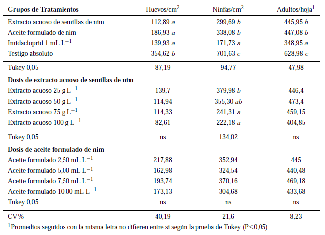 Fue evidenciada la reducción de las poblaciones adultas de B. tabaci en aquellas parcelas tratadas con nim en extracto acuoso y aceite, confirmándose la actividad repelente de estas sustancias, lo cual según Cañarte (2002), es atribuible a la presencia de volátiles en el nim, que son liberados como mensajes olfatorios, que evitan que los insectos colonicen el área tratada. La aplicación de nim, tuvo un efecto reductor sobre los estados inmaduros de B. tabaci, explicable por la disminución de adultos y el efecto disuasivo del nim sobre la oviposición de esta plaga, lo cual es corroborado con estudios realizados por Prabhaker et al. (1999).