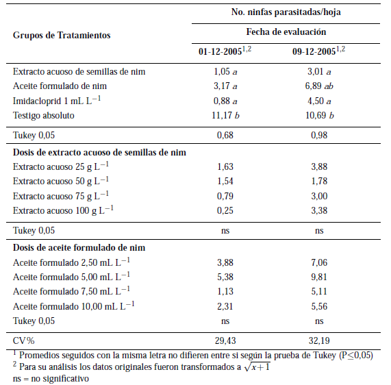 Cuando se evaluó el efecto del nim sobre el parasitismo de B. tabaci, se determinaron diferencias estadísticas entre grupos de tratamientos, en las dos fechas de evaluación, observándose, que el nim, sea como extracto acuoso o aceite y el imidacloprid, presentaron valores significativamente menores de ninfas de B. tabaci parasitadas, comparado con el testigo con agua. Por otro lado, no se reportaron diferencias estadísticas entre las dosis de extracto acuoso y aceite de nim para la variable ninfas parasitadas (Tabla 2). Durante esta investigación, fueron identificados los parasitoides Encarsia sp. y Eretmocerus sp. (Hymenoptera: Aphelinidae), ambos eficientes reguladores de B. tabaci