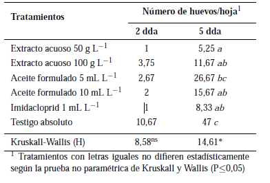 Al analizar la información sobre el efecto del nimcomo disuasivo de la oviposición de B. tabaci a nivelde invernadero, no se registró diferencias estadísticas entre tratamientos a los 2 dda. No obstante, a los 5 dda se marcaron diferencias estadísticas entretratamientos, estableciéndose tres rangos de significación. En los tratamientos con nim la población de huevos/hoja fue significativamente más baja que en el testigo con agua, con excepción del aceite formuladoen dosis de 5,00 mL L−1 (Tabla 3).
