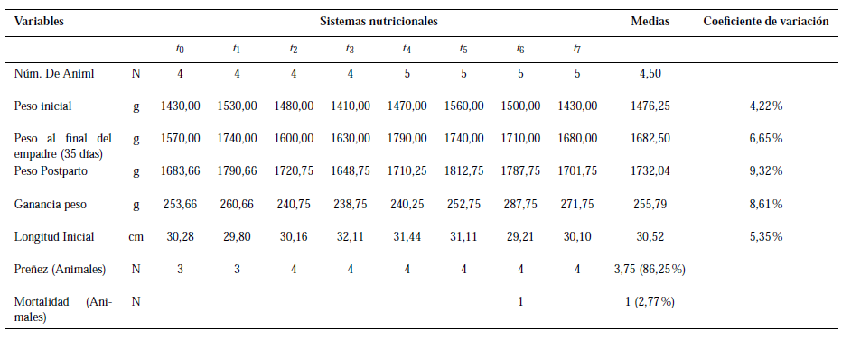 En la Tabla 1, se pueden ver los animales con los cuales se inició la investigación, para un nuevo sistema de suplementación alimenticia presentaron un peso promedio de 1476.25g, con un coeficiente de variación de 4,22%. Lo que indica que fue homogéneo, estas hembras, presentaron un peso superior al recomendado por Alvier, (2002), que indica que el peso al empadre debe ser de 540g, por lo señalado las hembras presentaron un peso superior debido a que los animales son provenientes de una mezcla genética entre macabeo y peruano mejorado y son manejados en forma técnica, como plateara Revollo (2009).
