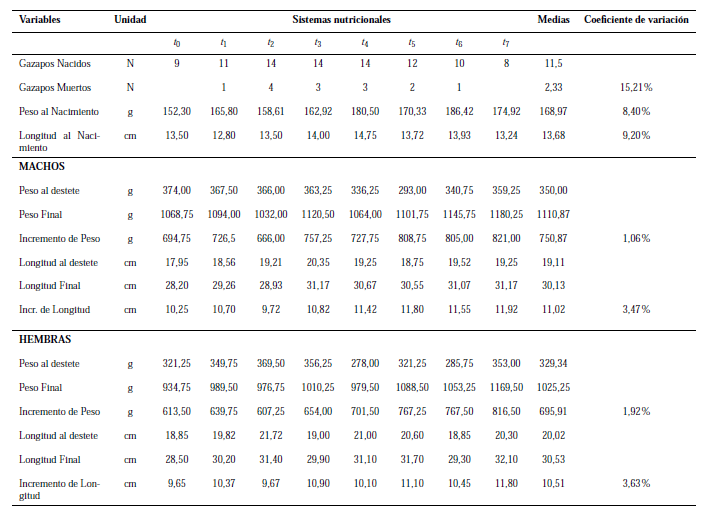 Del análisis de la varianza, se detectó diferencias significativas para sistemas nutricionales, el incremento promedio de longitud fue de 11,03 cm/cuy; mientras que, el coeficiente de variación fue del 3,47%, el cual es muy bueno para este tipo de investigación, así mismo se detectó diferencias significativas para sistemas nutricionales, el incremento promedio de longitud fue de 10,51cm/cuy; mientras que, el coeficiente de variación fue del 3,63 %.