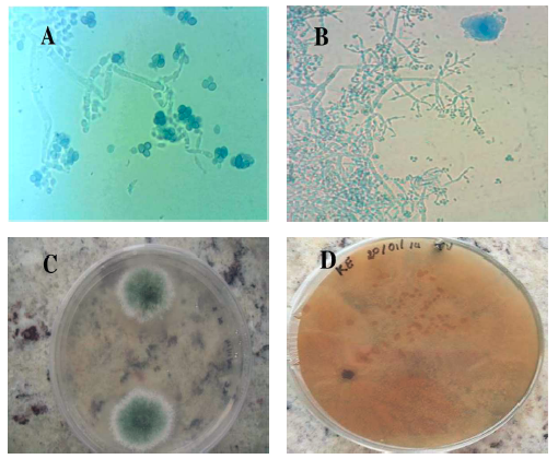 Las colonias presentaron un crecimiento rápido (5-8 cm), el micelio logró cubrir la superficie de los medios de cultivo en 5 días a 26◦C en Agar papadextrosa. Las colonias al inicio formaron pústulas algodonosas de un color blanco, posteriormente se compactaron y esporularon tomando un color verde de textura granular, con conidióforos ramificados visibles alrededor de la pústula. Los aislados nopresentaron el olor característico a coco; sin embargo al inverso de las colonias se puede observar visiblemente una coloración marrón-amarillenta, esto debido a la producción de cristales de color amarillo como se muestra en la Figura 1(c,d). Resultadosque concuerdan con las descripciones realizadaspor (Gams y Bissett, 1998).