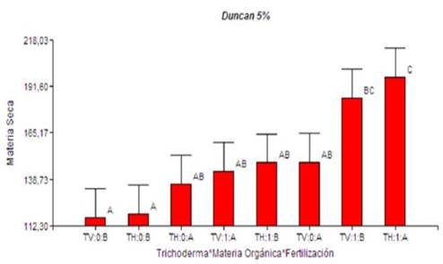 Cabe señalar que el aporte de materia orgánica jugó un papel importante en la producción tanto de materia verde como de materia seca, ya que en los tratamientos donde se agregó materia orgánica se registró un mejor comportamiento en comparación con el testigo y el tratamiento donde solo se utilizó fertilizante químico. La interacción (TH:1:A) presentó la mayor proporción de materia seca en gramos pero no tiene diferencia significativa con (TV:1:B), lo cual demuestra que la aplicación del hongo en presencia de materia orgánica puede reducir la cantidad de fertilizante sintético. Trichoderma tiene la capacidad de degradar la materia orgánica y solubilizar fosfatos orgánicos e inorgánicos mediante mecanismos quelantes y reductores (Cubillos et al., 2009).