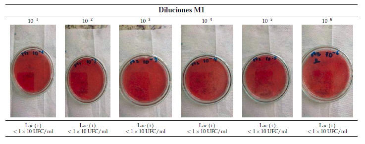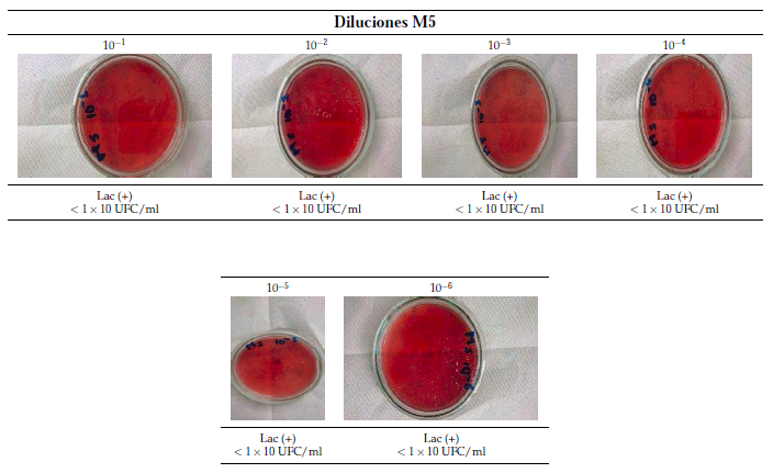 En la muestra 5 “M5”, se observó un ligero cambio en la coloración en ciertas zonas del medio de cultivo, especialmente en la dilución 10−5, pero no es un indicativo directo que demuestre la fermentación de la lactosa. Y tampoco es visible la presencia de UFC por lo cual el valor estimado es de < 1 × 10 UFC/ml por sensibilidad del método, con estos resultados se puede determinar que el jugo de naranja de la muestra 5 es apto para el consumo humano.