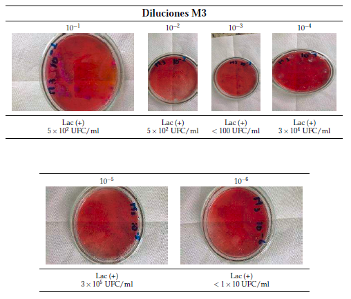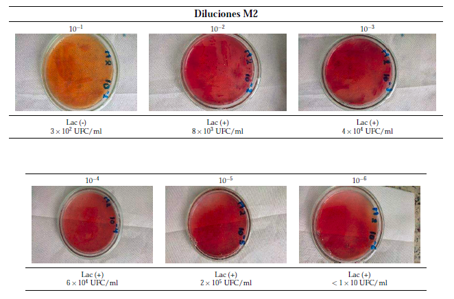 En la muestra 2 “M2”, en el cultivo de la dilución10−1 se observa claramente un cambio completoen la coloración del medio original, a las 72 horas predomina un color amarillo intenso, este color es el indicativo directo que demuestra una disminución del pH, lo cual determina la presencia de coliformes que no realizan la fermentación de la lactosa. En las demás diluciones se observa un ligero cambio de coloración en ciertas zonas, más visible en la dilución 10−6, lo cual indica que la fermentación de la lactosa está comenzando. La cuantificación promedio de la muestra 2 reveló que existen16x103 UFC/ml de bacterias Gram negativas.