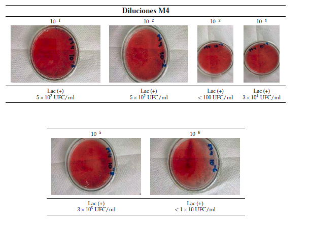 En la muestra 3 “M3”, se observó un cambio en la coloración en ciertas zonas del medio de cultivo, especialmente en la dilución 10-1 donde se nota el color indicador amarillo intenso lo cual alerta de la presencia de bacterias que no fermentan la lactosa, pero se observa claramente la proliferación de UFC rosadas, este es el indicativo de la presencia de coliformes que fermentan la lactosa y el color rosado intenso es característico de bacterias como la E. coli y Klebsiella. En las siguientes diluciones el ligero cambio de coloración no es un indicativo directo que demuestre la fermentación de la lactosa. En la cuantificación bacteriana se determinó que la muestra 3 presenta 5 × 102 UFC/ml de bacterias Gram negativas.