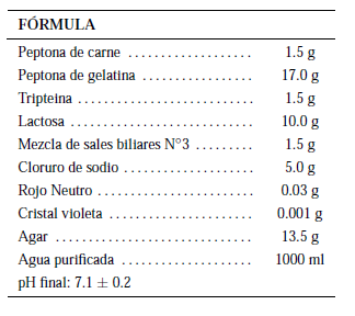 En el medio de cultivo Mac Conkey, la peptona es la fuente de aminoácidos y de otros factores de crecimiento, la lactosa es el hidrato de carbono fermentable, la bilis de buey estimula el crecimiento de las bacterias coliformes e inhibe a gran parte de la flora Gram positiva, y el púrpura de bromocresol es el indicador de pH. Los coliformes, son microorganismos que fermentan la lactosa, con producción de ácido y gas. Al acidificar el medio, se produce un viraje del indicador de pH, del color púrpura al amarillo (Aryal, 2015).