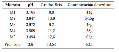 La determinación del pH se realizó mediante pH metro Mettler Toledo, mientras que la determinación de los Grados Brix se realizó mediante la utilización de un refractómetro Atago, a partir de los Grados Brix se calculó la concentración de azúcar en cada muestra teniendo en cuenta que el volumen aproximado de cada jugo de naranja fue de 500ml, el cual dio los siguientes resultados visibles en la Tabla 2. El promedio del pH, de los Grados Brix y la Concentración de Azúcar de las 5 muestras de jugos de naranja fue de 3.6, 10.54 y 53.1 respectivamente.